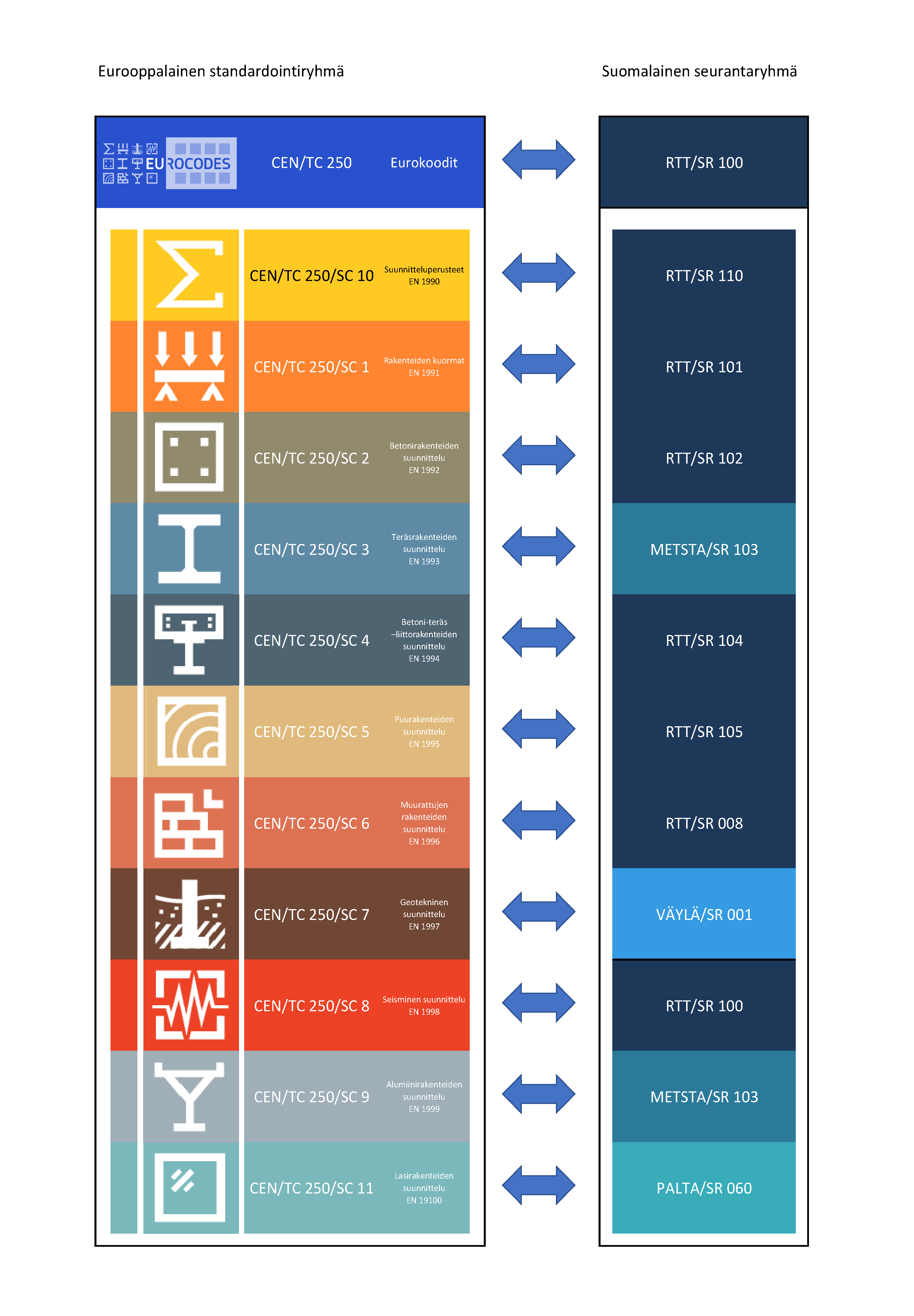 Jos olet kiinnostunut olemaan mukana vaikuttamassa eurokoodien sisältöihin niin kansalliset seurantaryhmät ovat ovat avoinna kaikille. Liittyminen tästä linkistä. Oheisessa kuvassa on kutakin standardointiryhmää seuraava kansallinen seurantaryhmä.